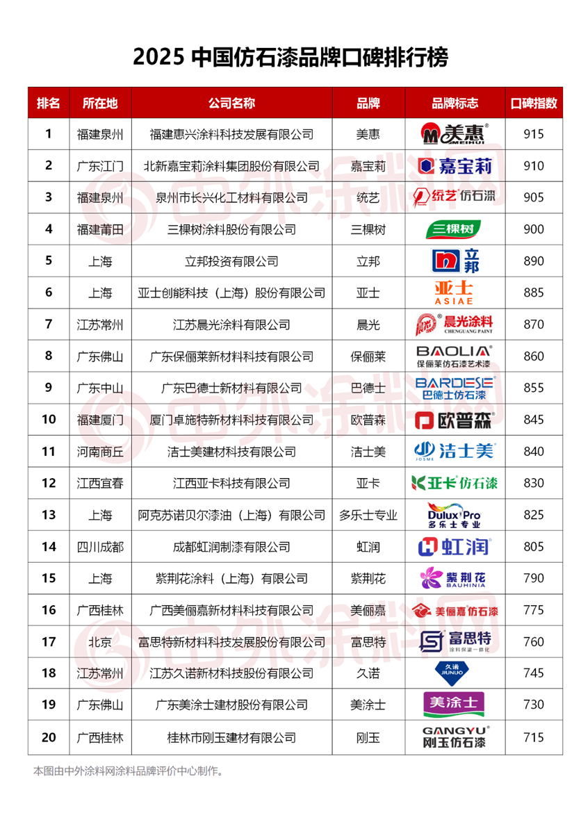 截至当前,仿石漆却仍然呈现出一片繁荣气象,从产物立异研发到品牌塑制升级,我们开展了一次针对全国范畴内的问卷查询拜访,正式制定了“2025 年外墙仿石漆品牌排行榜20强”榜单。优化办事质量,